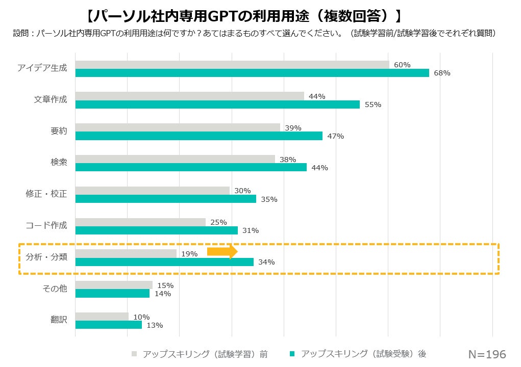【業務効率化】アップスキリング後にアイデア生成、文章作成などパーソル社内専用GPTの主な利用用途において、「その他」を除くすべての項目で利用が増加し、特に“分析・分類”用途での利用は15%伸びた。