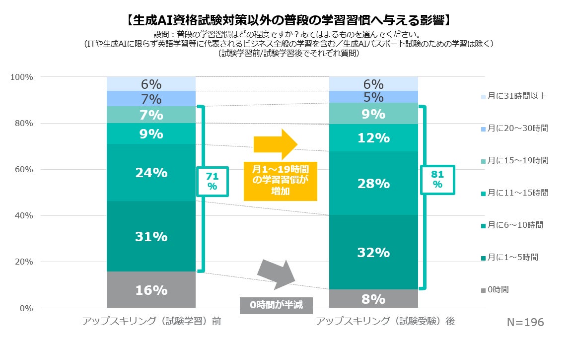 【学習習慣】生成AI資格試験(生成AIパスポート)の学習をきっかけに学習習慣の無かった社員が半減した。また、月1~19時間の学習をする社員が増え、生成AIに限らないさまざまな学びの習慣を継続している。