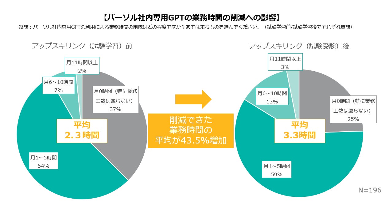・業務効率化への影響:パーソル社内専用GPTを活用することで、平均2.3時間の業務時間の削減ができていたが、生成AI活用に関するアップスキリングに取り組んだ後は、パーソル社内専用GPTの用途拡大・業務効率化がさらに進み、業務時間の削減は平均3.3時間に増。アップスキリング前後では43.5%増加した。