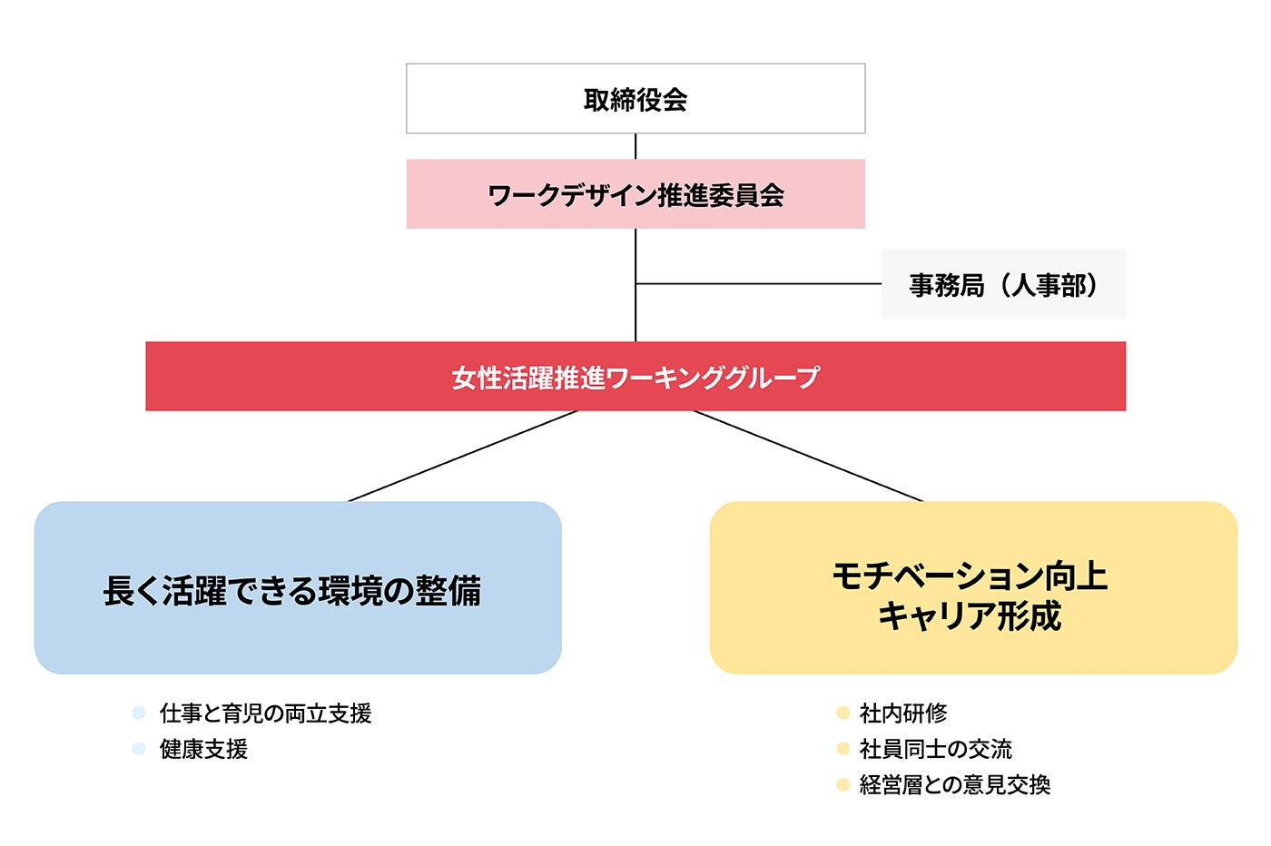 当社では、多様な人材が最大限活躍するための「働き方」を「デザインする」ことを目的とした「ワークデザイン推進委員会」を設置しており、この委員会の分科会として「女性活躍推進ワーキンググループ」を設け、女性活躍を推進していく為の体制を整えています。女性活躍推進ワーキンググループでは、参画する女性社員が現場の声を吸い上げ、人事部と連携することで、女性が働きやすい環境づくりのための制度設計に反映させています。また、女性活躍推進の進捗状況及び重要な取り組みについては、取締役会を経て経営層に定期的に報告されます。
