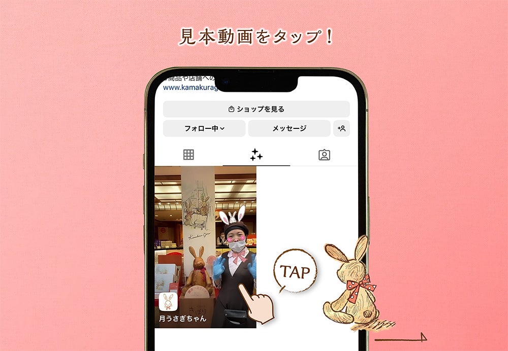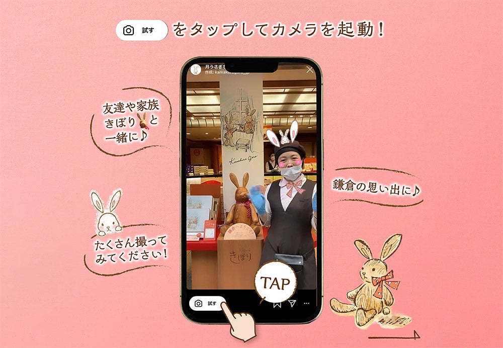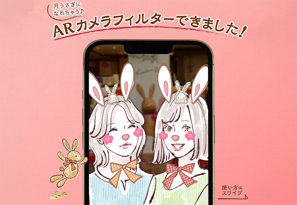 『月うさぎ』とは、鎌倉・小町通りに本店を構えるスイーツショップ「鎌倉五郎本店」のシンボルキャラクター!「最高にかわいい」「こどもも大喜び!」「グッズ化してほしい…」と、ブランド誕生当時から愛され続けています。めぐりめぐってきた、せっかくの“うさぎ年”。みんなと一緒にお祝いしたくて、月うさちゃんとお揃いになれるARが登場しました。
