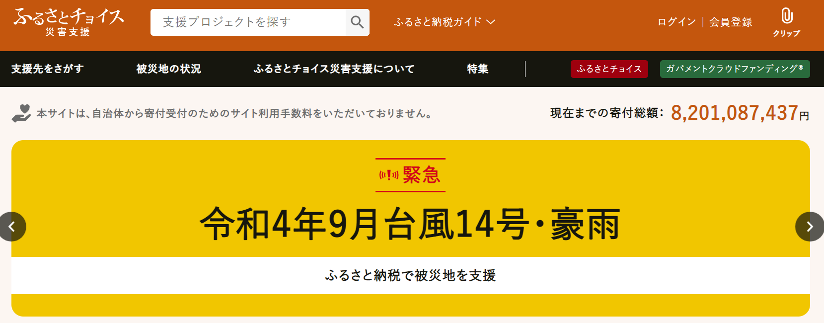 ※ ふるさとチョイス災害支援は、自治体から寄付受付のためのサイト利用手数料をいただいておりません。
