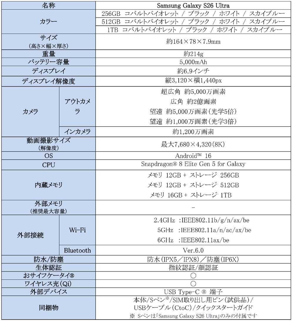 <主な仕様:「Samsung Galaxy S26 Ultra」>