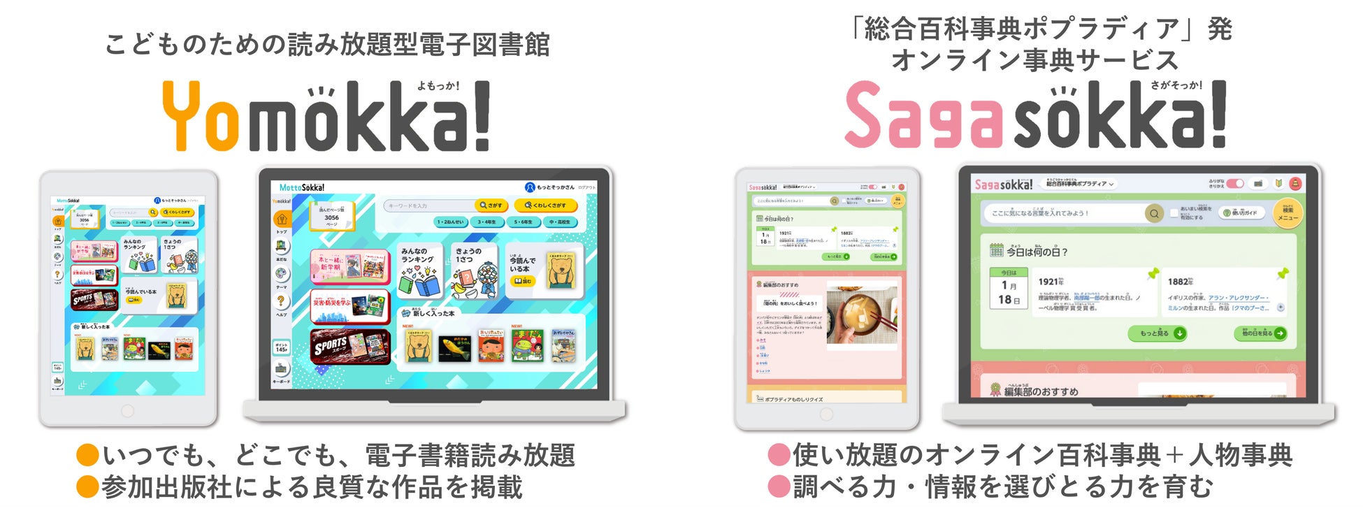 こどものための読み放題型電子図書館『Yomokka!』と、「総合百科事典ポプラディア」発オンライン事典サービス『Sagasokka!』の2つのサービスを提供しています。