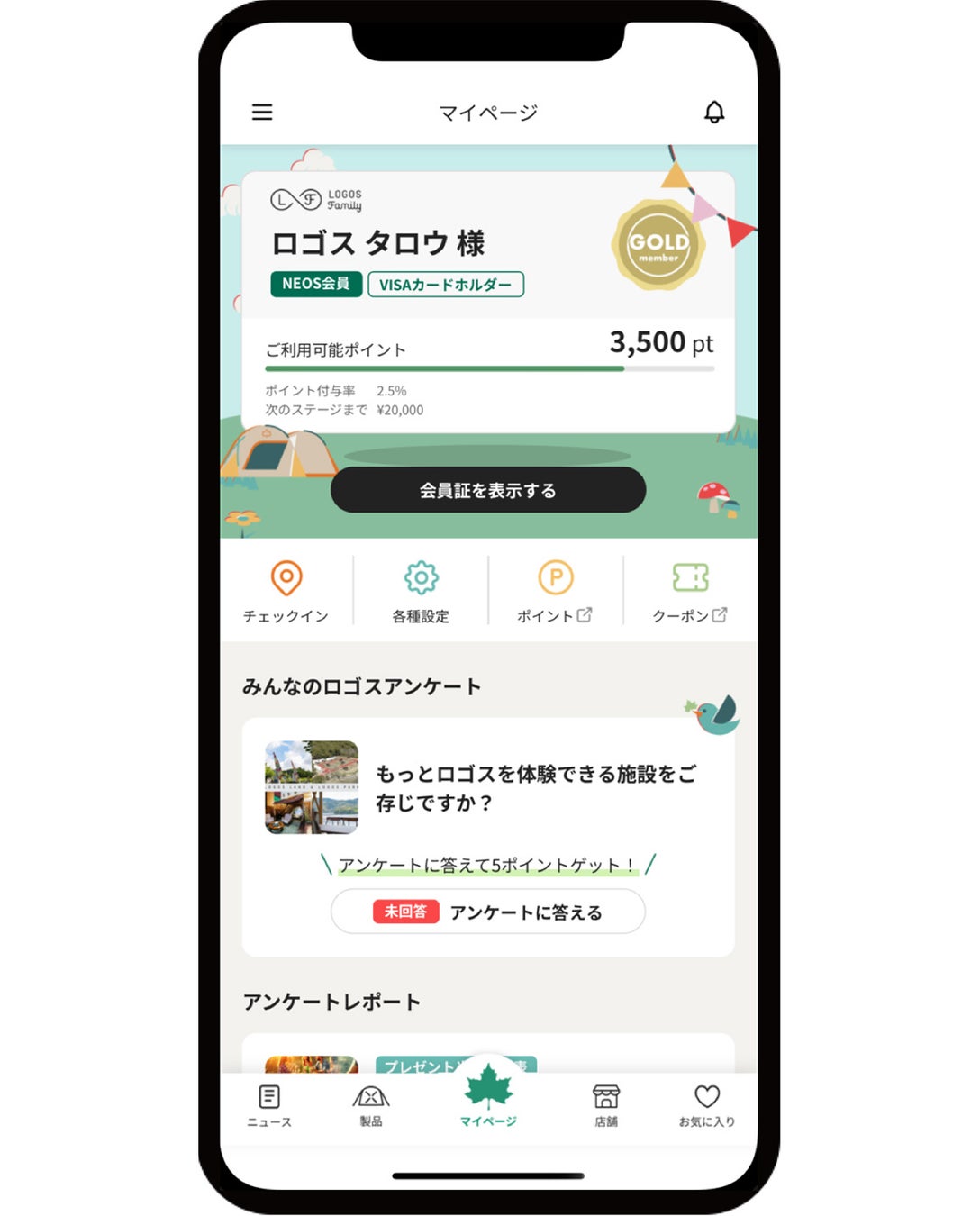 店舗にて提示いただく会員証の他、ポイントやクーポンの利用、店舗へのチェックインなど、LOGOS Family会員向けの各種機能をご利用いただけます。