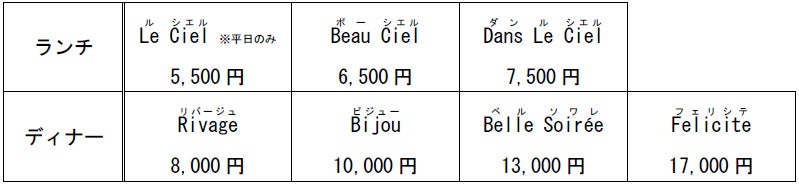 各コースはランチ3 種類、ディナー4 種類をご用意しております。(おひとりさまあたり/税サ込)