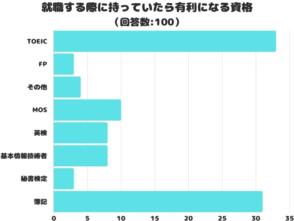 就職する際に持っていたら有利になる資格をアンケートにて調査したところ、1位は「TOEIC」でした。