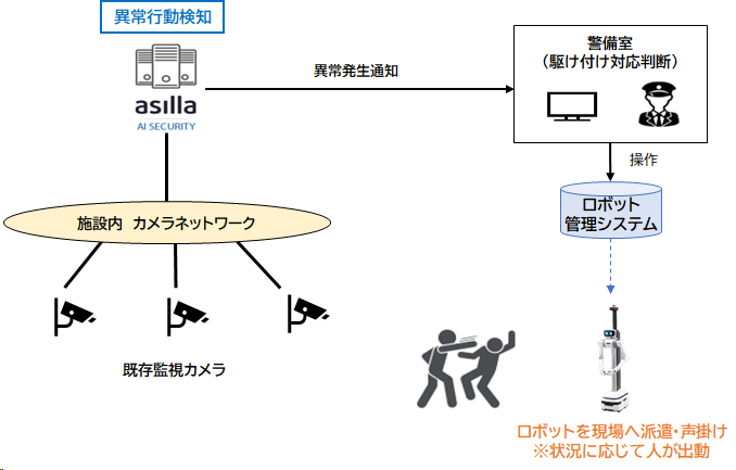 加えて、既設の監視カメラ映像を活用した異常検知を実現するAI警備システム「AI Security asilla」により、「AIで異常検知した事象に対し、初動対応としてロボットを向かわせる」といった、ロボットとAI警備システムの組み合わせによるロボット運用のさらなる効率化に関する効果測定・評価を行います。