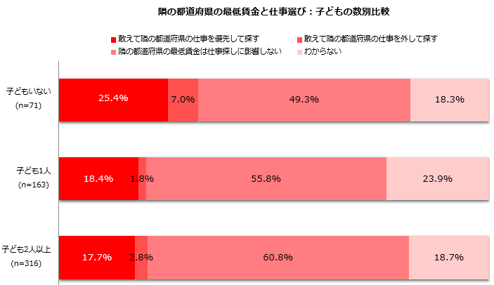 全国平均で初めて1000円を超えた最低賃金。仕事と家庭の両立を希望する主婦・主夫層に「最低賃金は、都道府県ごとに金額が異なります。もし隣の都道府県の最低賃金の方が高い場合、あなたの仕事探しにはどのような影響がありますか」と尋ねたところ、「隣の都道府県の最低賃金は仕事探しに影響しない」との回答が6割近くとなったものの、「敢えて隣の都道府県の仕事を優先して探す」と回答した人も18.9%と2割近くいました。また、2024年に収入上限を設定する人としない人との比較では、「敢えて隣の都道府県の仕事を優先して探す」と回答した比率は、「設定しない人」の方が7.4ポイント高くなりました。さらに子どもの数別で比較したところ、お子さんの数が多いほど「敢えて隣の都道府県の仕事を優先して探す」と回答した比率は少なくなり、お子さんがいない人と2人以上の人との差は7.7ポイントでした。収入上限や育児など仕事する際の制約が少ない人の方が、通勤時間などの時間的制約を意識する必要性が低く、隣の都道府県の仕事であっても優先して探しやすい状況にあるのかもしれません。
