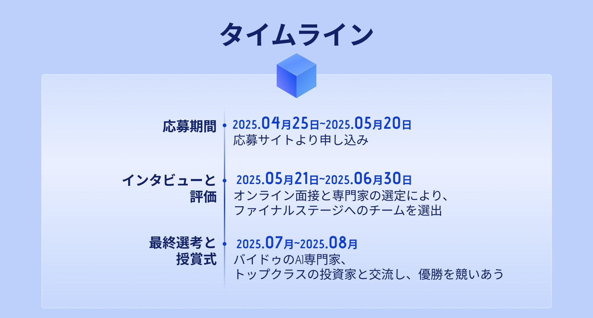 Baidu, Inc.(会長兼CEO李彦宏(ロビン・リー) 本社:中華人民共和国北京市、Baidu米NASDAQ:BAIDU、以下Baidu )は、次世代のAIリーダーを発掘し、育成するためのイベント「第三回百度文心杯」の開始を発表いたしました。コンテストへの応募期間は2025年4月25日(金)〜5月20日(火)まで。