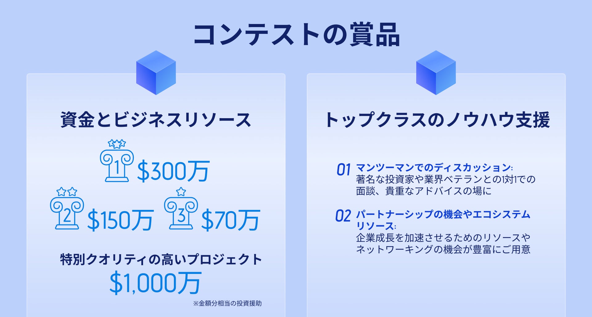 2.最大1,000万ドル(約15億円)相当の賞品とビジネスリソースによるサポート
