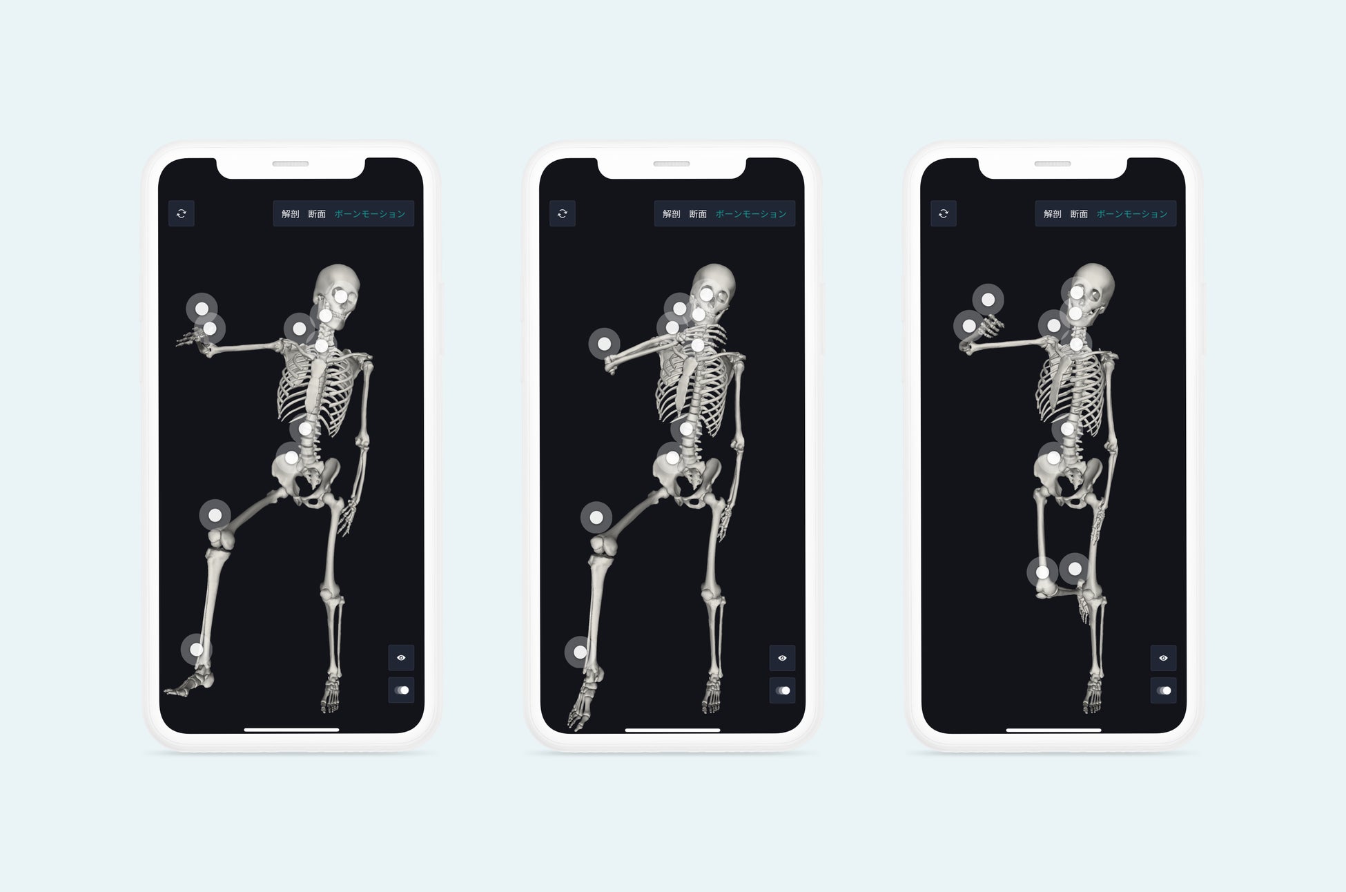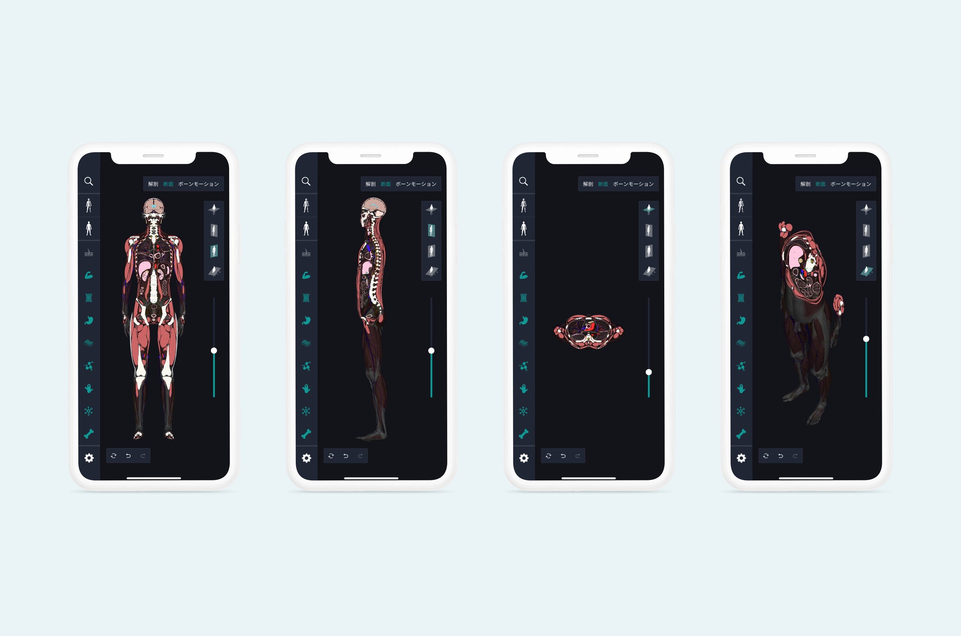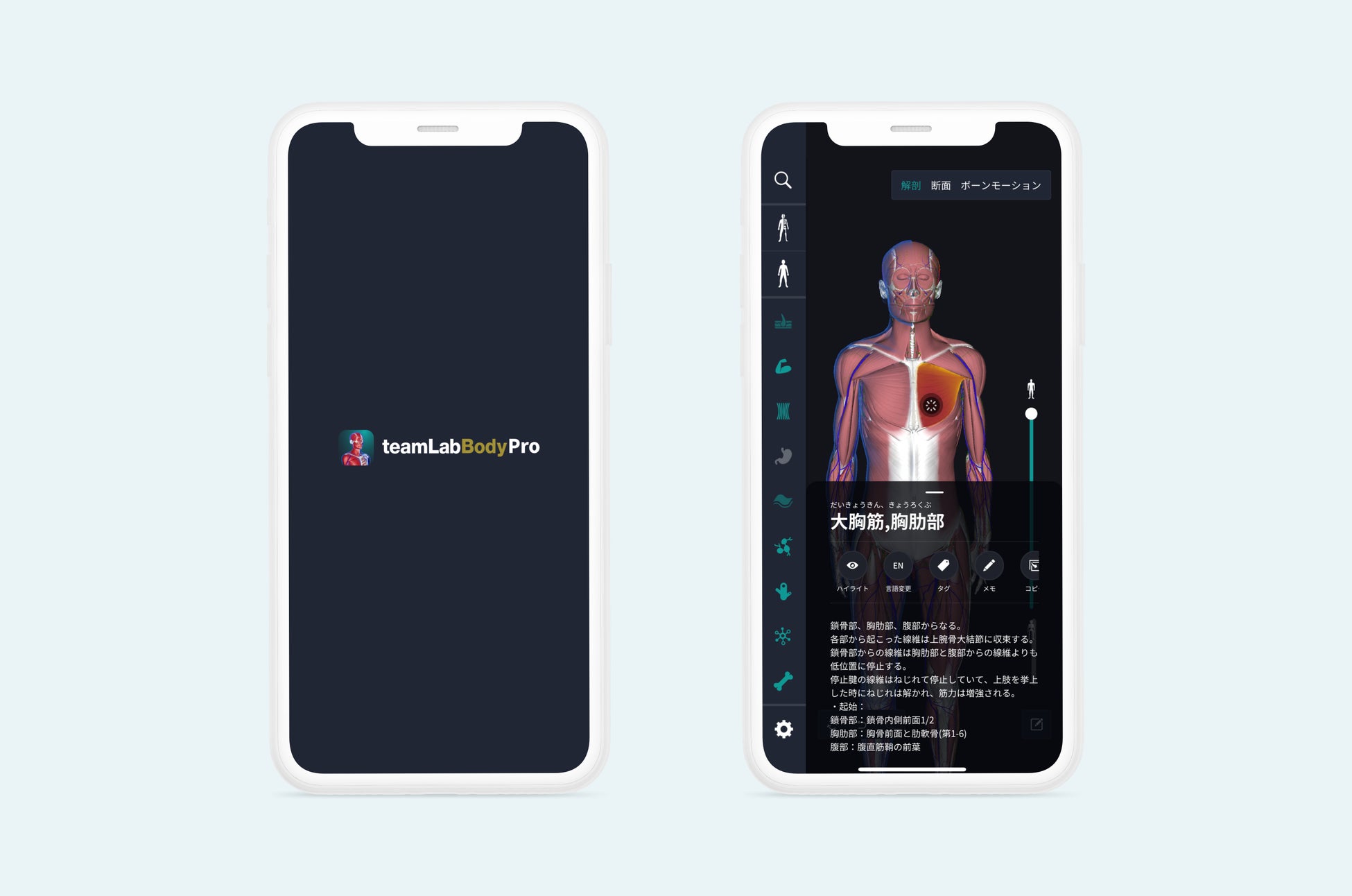 旧アプリ「3D人体解剖学 チームラボボディ」から大きくアップグレードし、医学書などでは、直感的に分かりずらい人体の動きをアニメーションで確認できる「運動解剖学機能」や、直感的にスライダーを動かすだけで、人体の全ての断面を閲覧できる「断面図機能」が追加されました。
