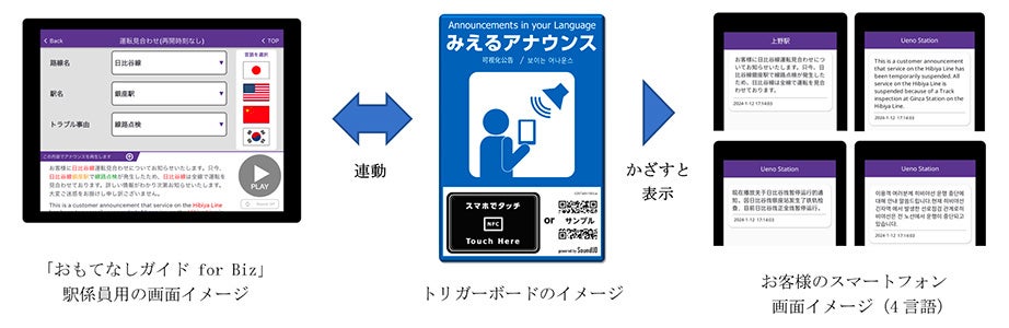 本サービスは、駅係員が操作して4言語(日・英・中・韓)のアナウンスを放送できるタブレット/スマートフォン向けアプリ「おもてなしガイド for Biz」と、お客様がお持ちのスマートフォンをかざすかQRコードを読み取るとアナウンスの内容を文字表示できる専用のパネル「トリガーボード」から構成されます。
