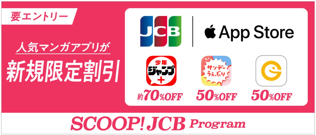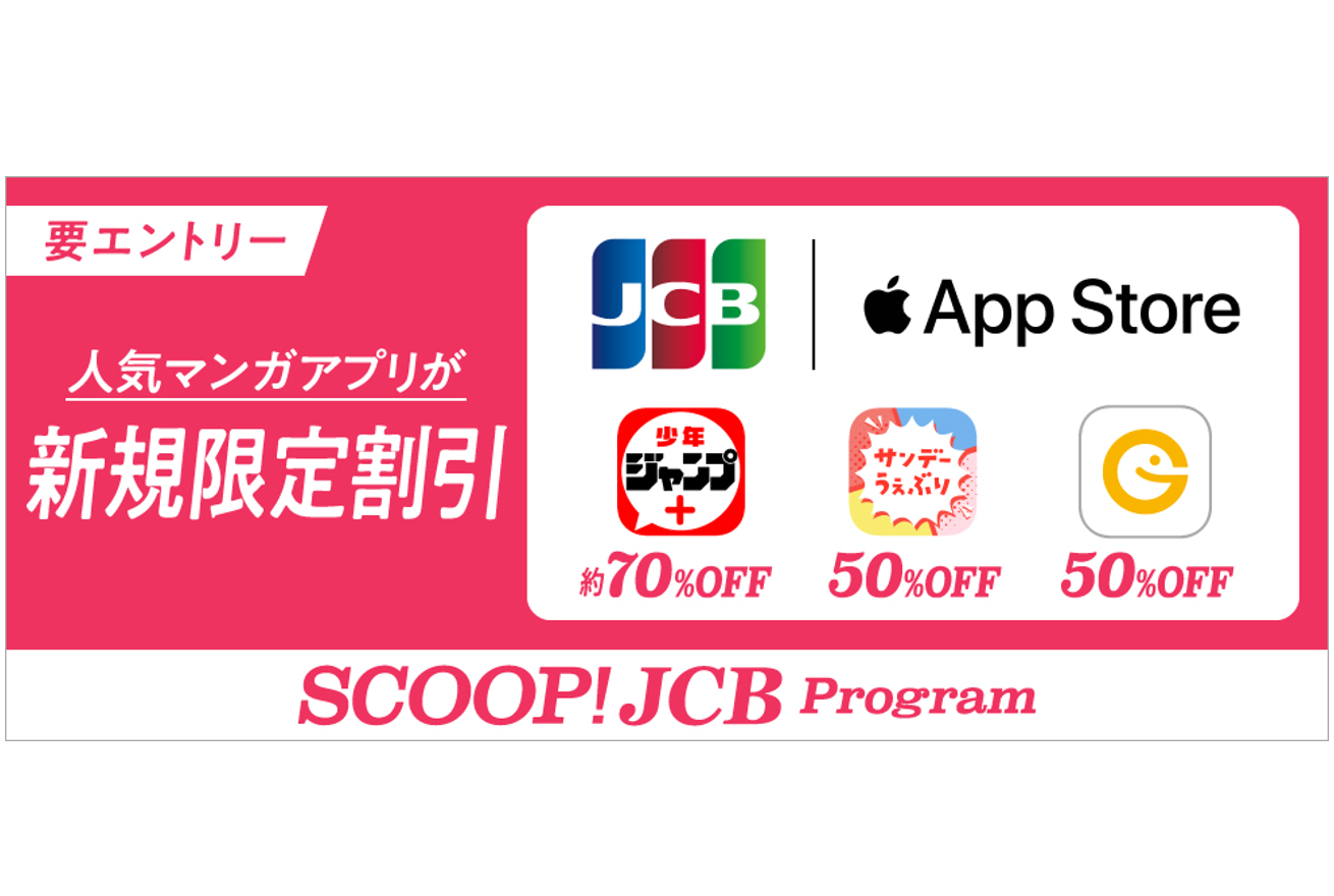キャンペーン期間中に、JCBカードでエントリーのうえ、対象アプリの定期購読を新規でご利用開始すると、対象アプリの割引が適用されます。 <対象アプリおよび優待> ・少年ジャンプ+(初月約70%OFF)※月額定価980円(税込み)が300円 ・サンデーうぇぶり(2ヶ月50%OFF)※月額定価1,080円(税込み)が540円 ・GANMA!(3ヶ月50% OFF)※月額定価680円(税込み)が340円 |