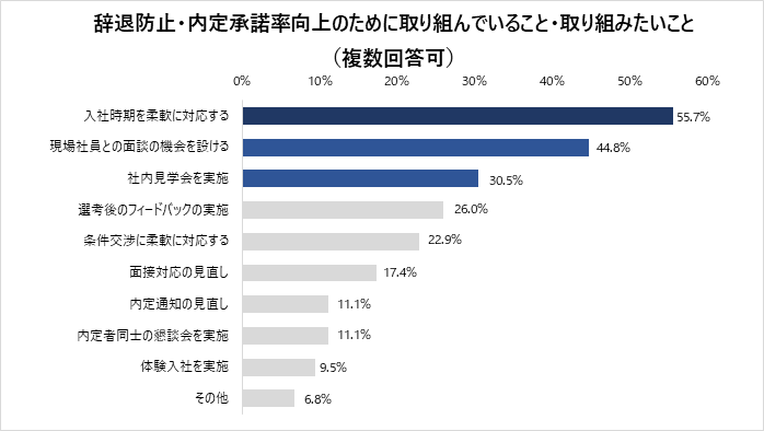 (4)辞退防止のための取り組みは「入社時期を柔軟に対応する」が最多。次いで「現場社員との面談の機会を設ける」