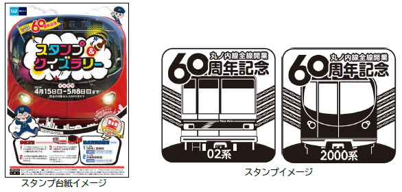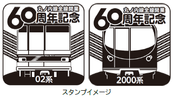 スタンプには現在丸ノ内線で活躍している02系車両と最新の2000系車両をデザインしています。是非、ご家族やご友人と一緒に、『丸ノ内線全線開業60周年』記念スタンプ&クイズラリーをお楽しみください。今後も東京メトロは沿線地域の皆様とともに地域の魅力の創出に取組み、東京に集う人々の活き活きとした毎日に貢献してまいります。