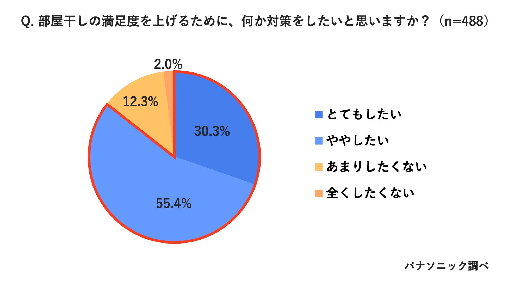 「部屋干しの満足度を上げるために、何か対策をしたいと思いますか?」という質問では、「とてもしたい」(30.3%)、「ややしたい」(55.4%)と、85.7%が部屋干しの対策について意欲的であることがわかりました。