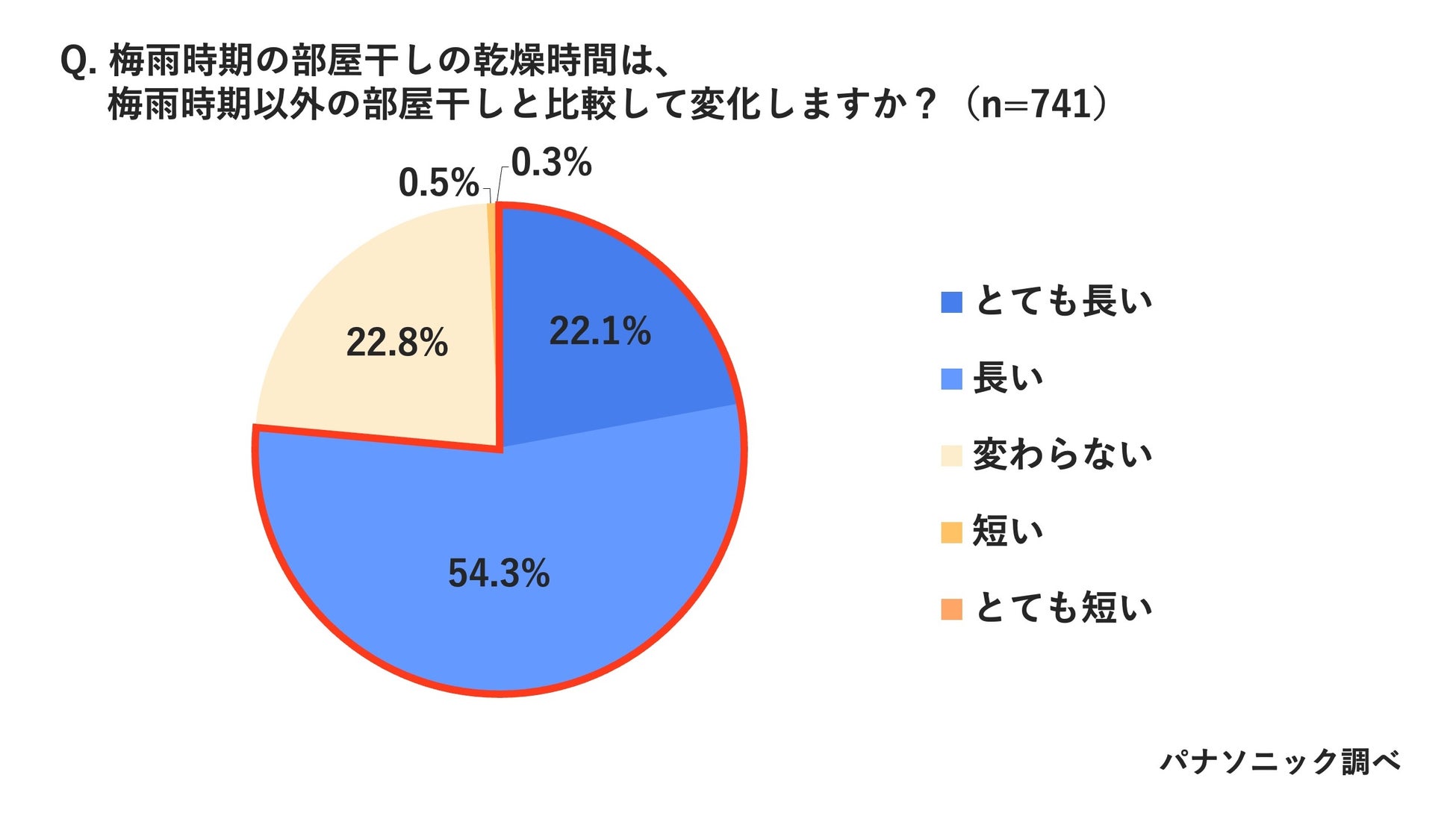 梅雨のような湿度が高い時期は、部屋干しする洗濯物がより乾きにくくなるもの。梅雨時期以外と比較したとき、「部屋干しの乾燥時間が長い」と回答した方は76.4%にものぼります。