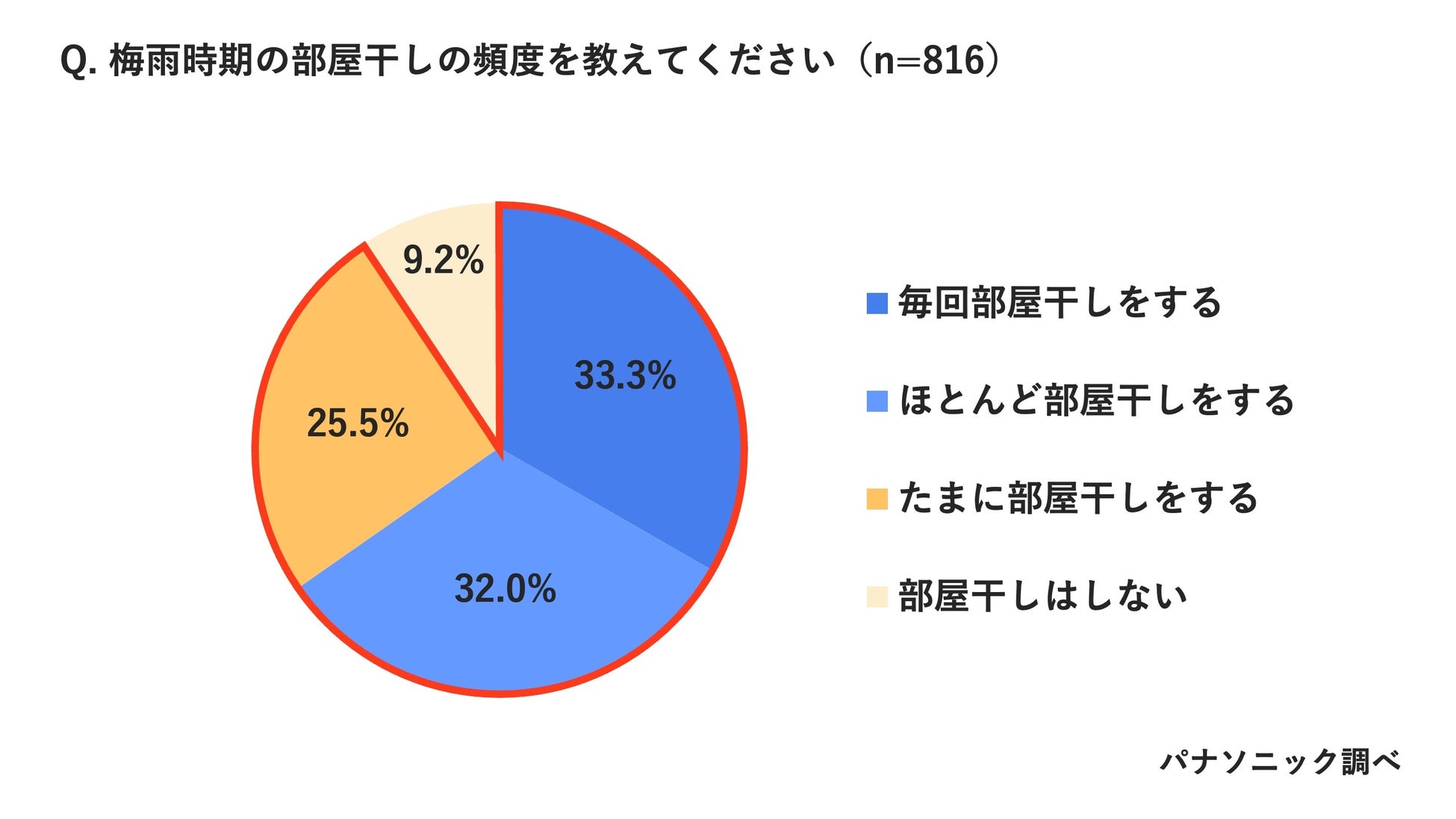 はじめに、梅雨の部屋干しの頻度をたずねたところ、「毎回部屋干しをする」(33.3%)、「ほとんど部屋干しをする」(32.0%)、「たまに部屋干しをする」(25.5%)と、90.8%が部屋干しを行い、中でも65.3%が日常的に部屋干ししていることがわかりました。