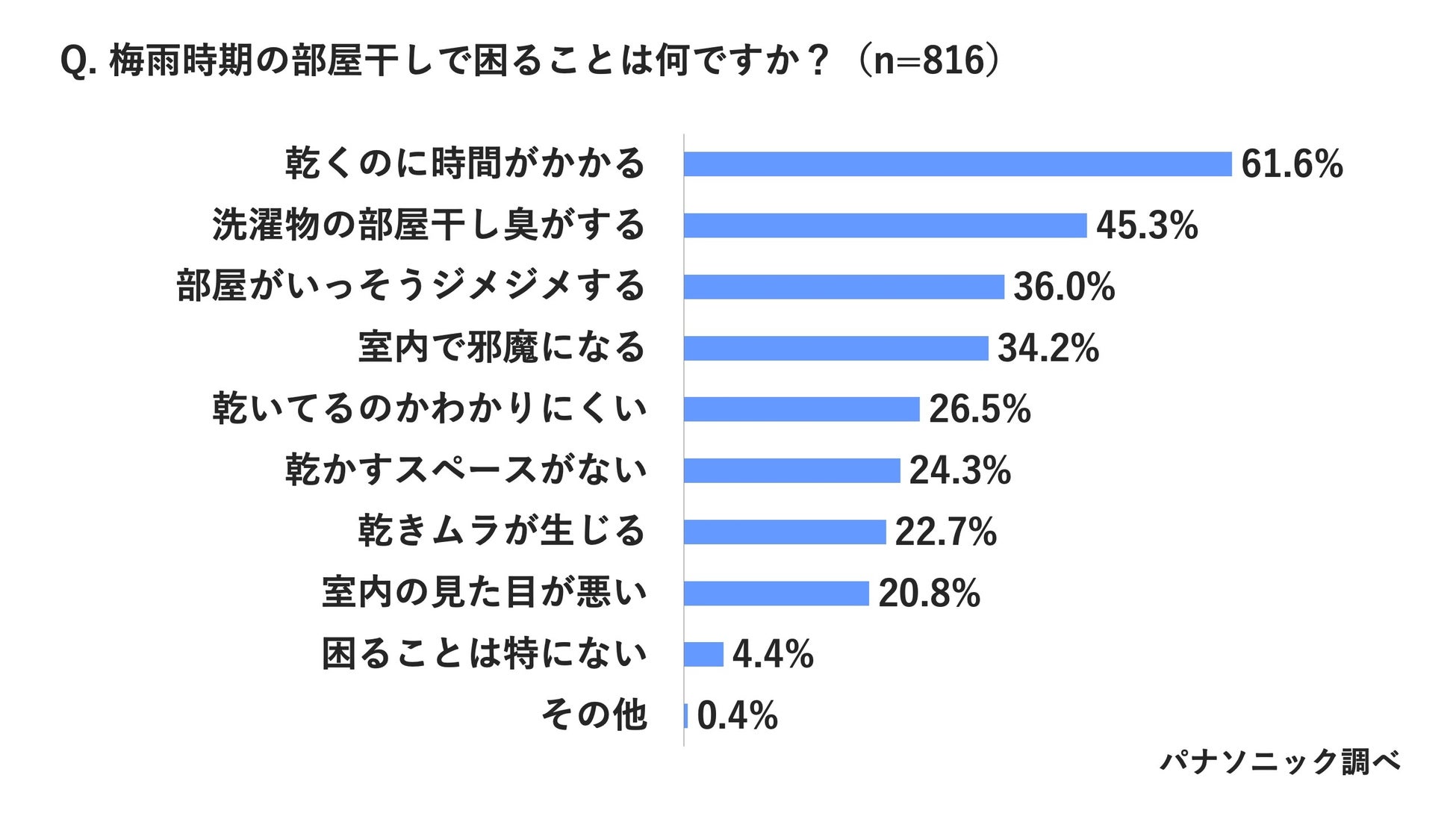 多くの方が部屋干しをする一方で、梅雨時期の部屋干しの悩みとしては、「乾くのに時間がかかる」(61.6%)が圧倒的に多く、続いて「洗濯物の部屋干し臭がする」(45.3%)、「部屋がいっそうジメジメする」(36.0%)という結果になりました。