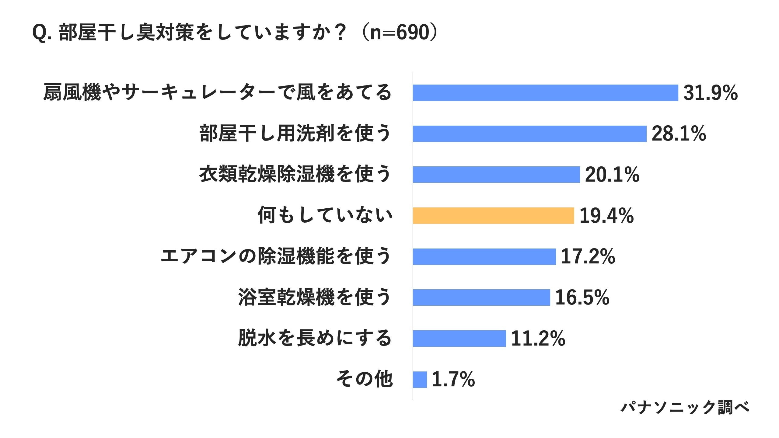 部屋干し臭対策については、「扇風機やサーキュレーターで風をあてる」(31.9%)、「部屋干し用洗剤を使う」(28.1%)、「衣類乾燥除湿機を使う」(20.1%)がTOP3に。一方で、部屋干し臭を感じている方は多いものの、19.4%は「何もしていない」と回答しました。
