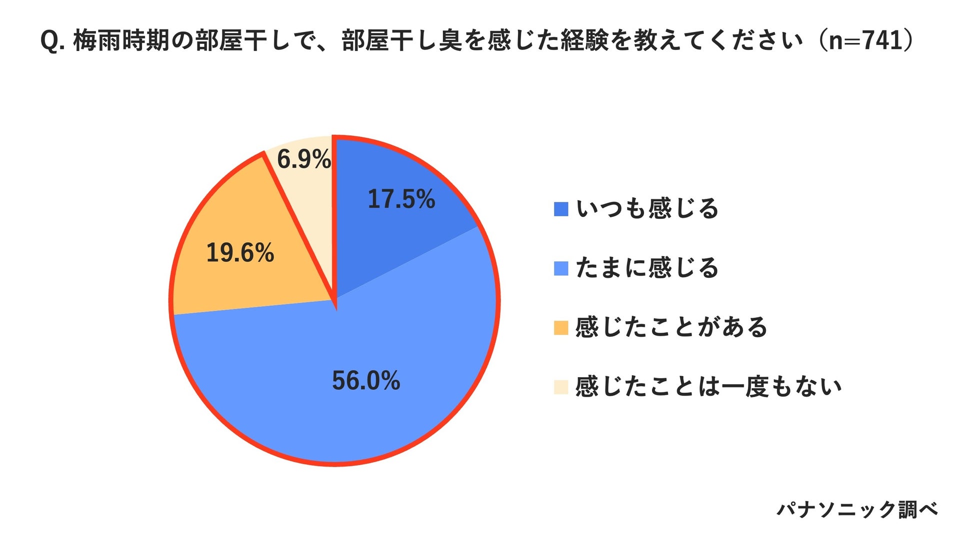 このような乾燥時間の長さを反映して、部屋干し臭については、「いつも感じる」(17.5%)、「たまに感じる」(56.0%)、「感じたことがある」(19.6%)と93.1%が部屋干し臭を感じた経験があると回答しています。