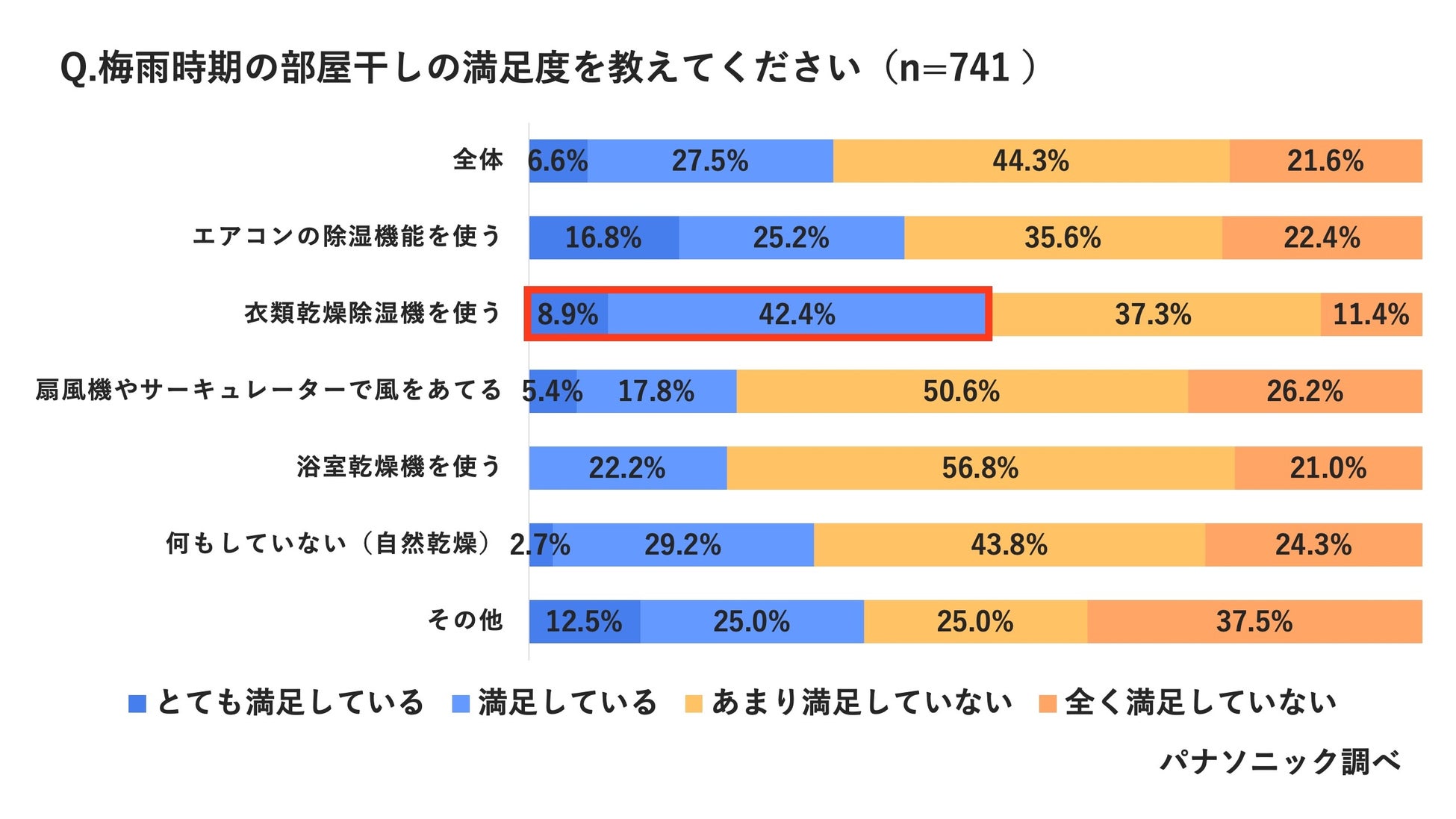 部屋干しの満足度については、「満足している」が34.1%に対し、「満足していない」が65.9%と、多くの方が梅雨時期に部屋干しをするにも関わらず、その満足度はかなり低いことがわかります。さらに部屋干しの方法別で詳しく見ると、衣類乾燥除湿機を使用する方のみ「満足している」が51.3%と過半数を超えており、部屋干しの方法の中でも最も満足度の高い乾燥方法であることがわかりました。