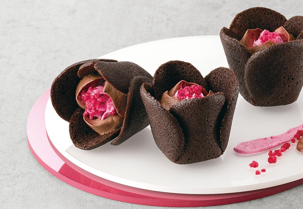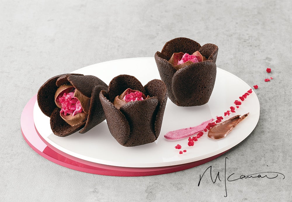 「バレンタインシーズンの新作ということで、今回はショコラを一番に感じてほしいと思い、チョコレート選びからこだわりました。(シェフ金井理仁)」濃密クーベルチュールのショコラクリームには、カカオ分80%のハイカカオショコラを使用。ショコラのベストパートナー、甘酸っぱく華やかなカシスの香りがアクセントです。バレンタインシーズンの開幕を祝って、<モードな赤と黒>をテーマに とびきりオシャレにドレスアップしたチューリップローズを心ゆくまでご堪能くださいませ。