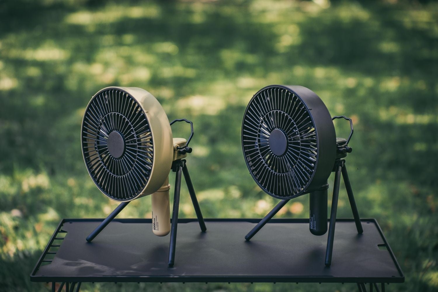 夏は涼しい風を運び、冬はテント内をくまなく暖めて季節を問わずに使えるミドルサイズのファンです。三脚に取り付けたり、天井からつるしたりと様々な使い方ができます。