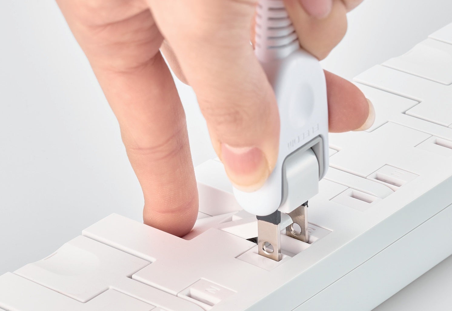 レバーを押すだけで簡単に片手でプラグが抜ける電源タップです。吊り穴・フック付きで床面以外にも設置して使えるので、座ったままでの抜き挿しにも便利です。手が不自由な方や力が弱い方はもちろん、年齢や性別を問わず誰でも便利に使えます。
