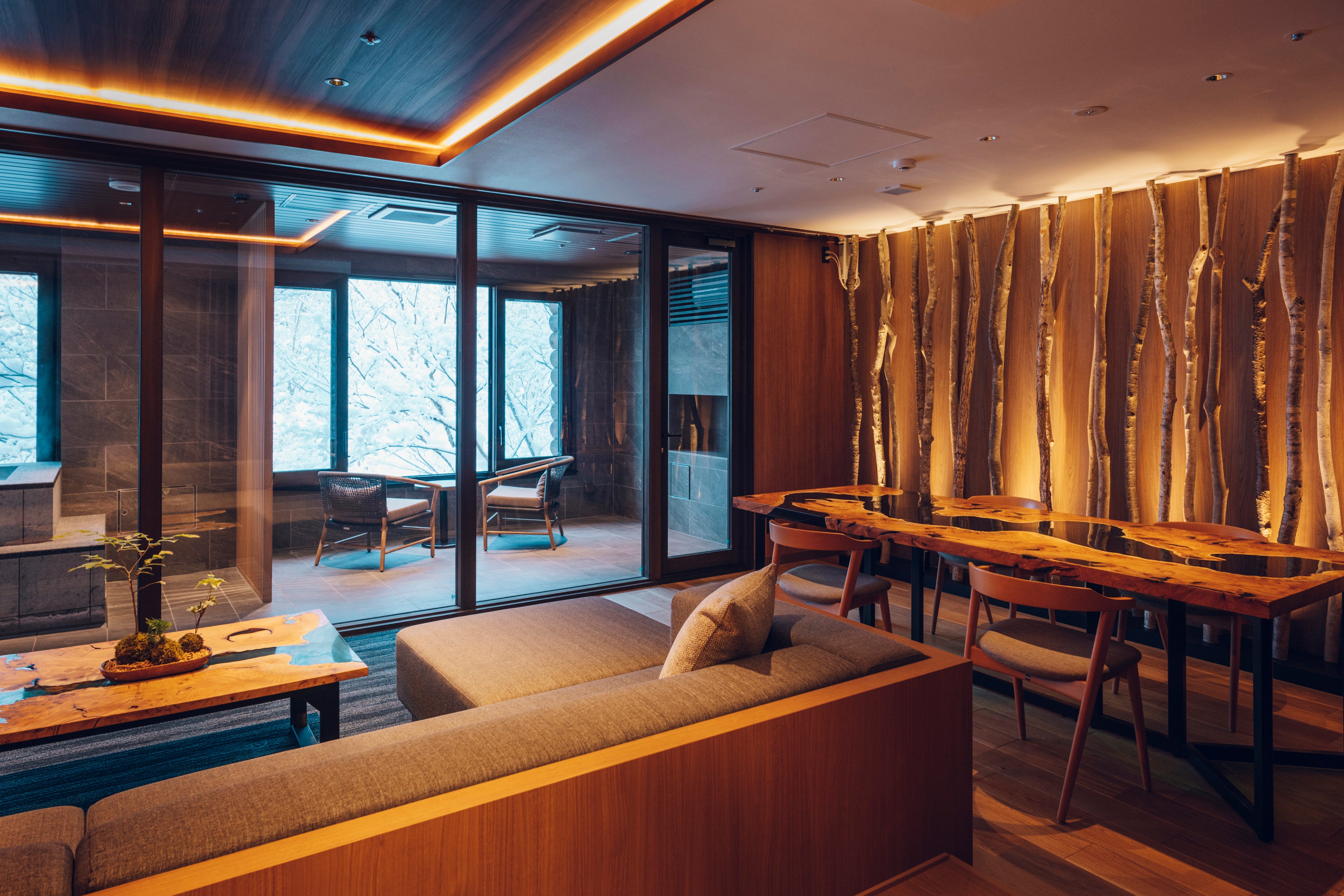 湯上りも景色を楽しみながらくつろげる、特等席を用意しました。目の前に広がるのは、純白の雪景色と滝の絶景です。しんと静まり返った森を眺めながら、火照った体をくつろげることができます。湯上りも暖かく過ごせるコートと、特製のホットスパイスティーをはじめとした、さまざまなドリンクを用意しました。紅茶とスパイスの香りに包まれ、湯上りも特別な時間を過ごせます。