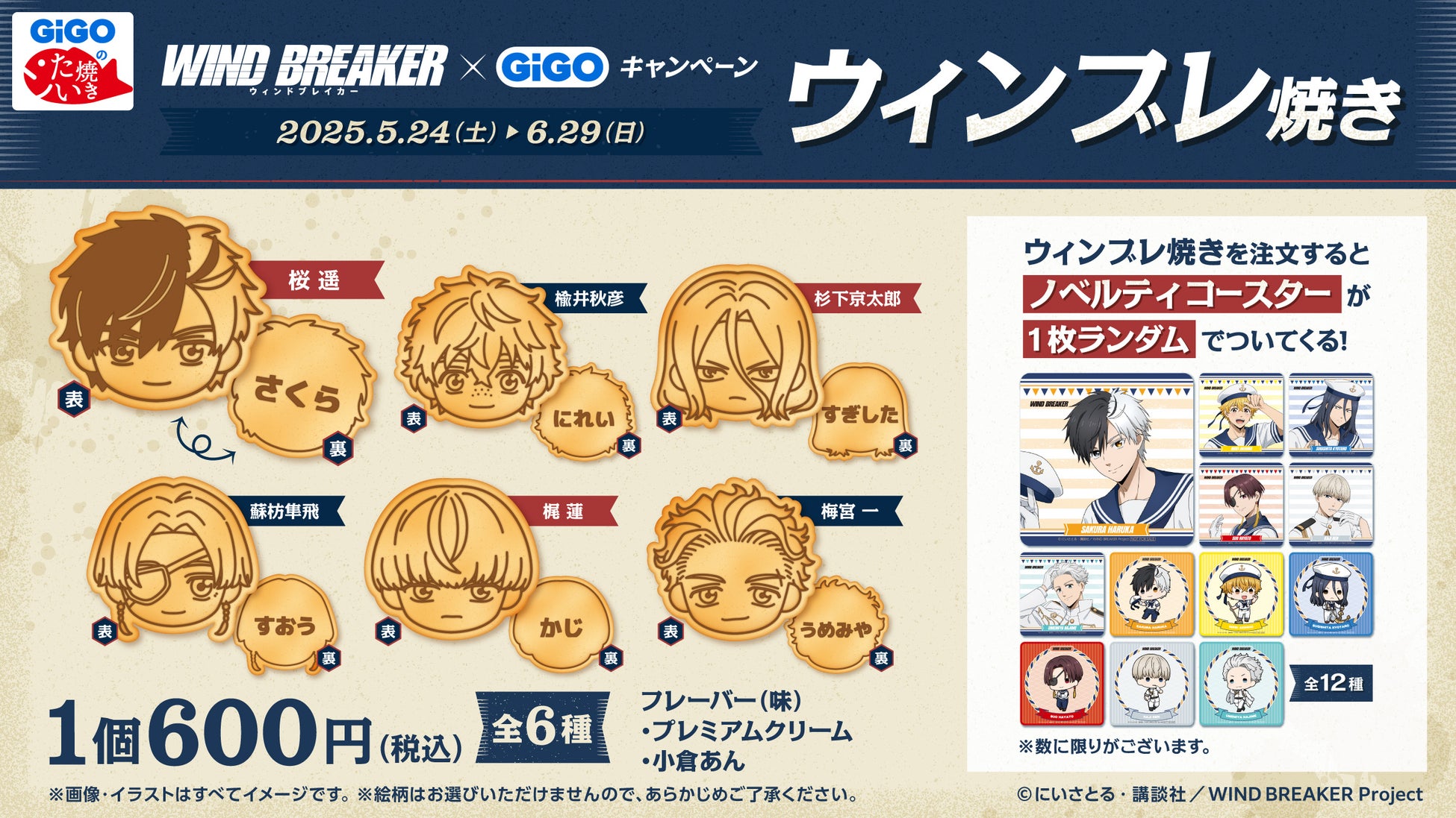 GiGOのたい焼きにて、描き下ろしキャラクター6名をモチーフにしたコラボたい焼き「ウィンブレ焼き」を販売いたします。「ウィンブレ焼き」ご購入1点につき、オリジナルコースター(全12種)をランダムで1枚進呈いたします。