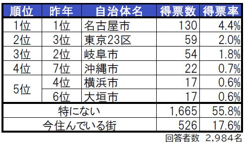 住みたい街1位は2年連続で名古屋市。2位東京23区、3位岐阜市。