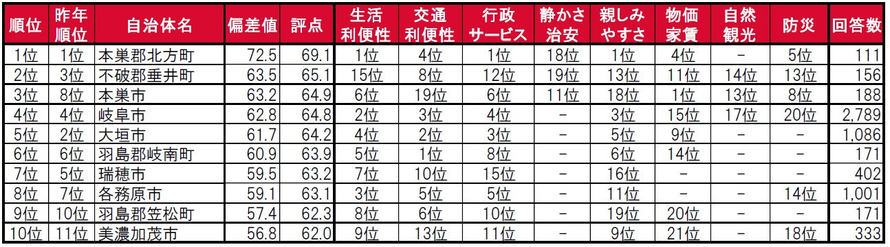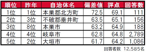 住みここち1位は4年連続で本巣郡北方町。2位不破郡垂井町、3位本巣市。