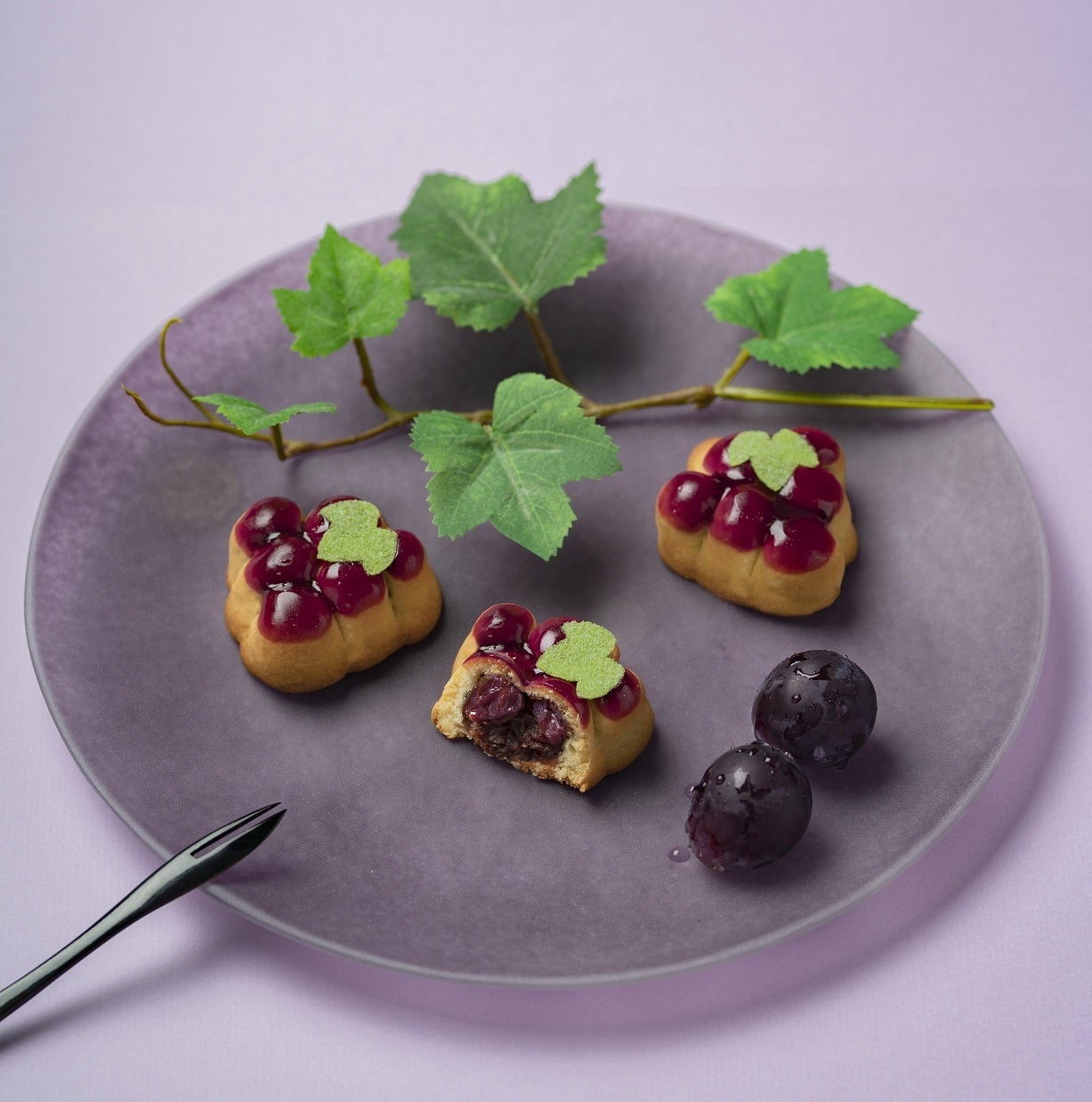 摘みたての葡萄のような果実感が楽しめる焼き饅頭。「餡:果肉=5:5」の割合でつくられた葡萄餡は、赤ワイン風味の蜜に漬けた干し葡萄が芳醇な風味を引き出し、シャキシャキとした果肉感やフルーティーな味わいをお楽しみいただけます。