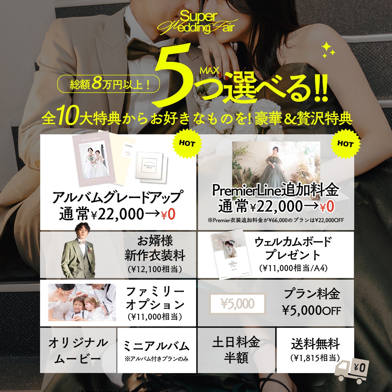 その他土日祝日料金が半額、お婿様の新作衣装料金無料など人気オプションが5つもセレクト可能。おふたりでどれが良いかな?と悩むのも楽しみの一つです。