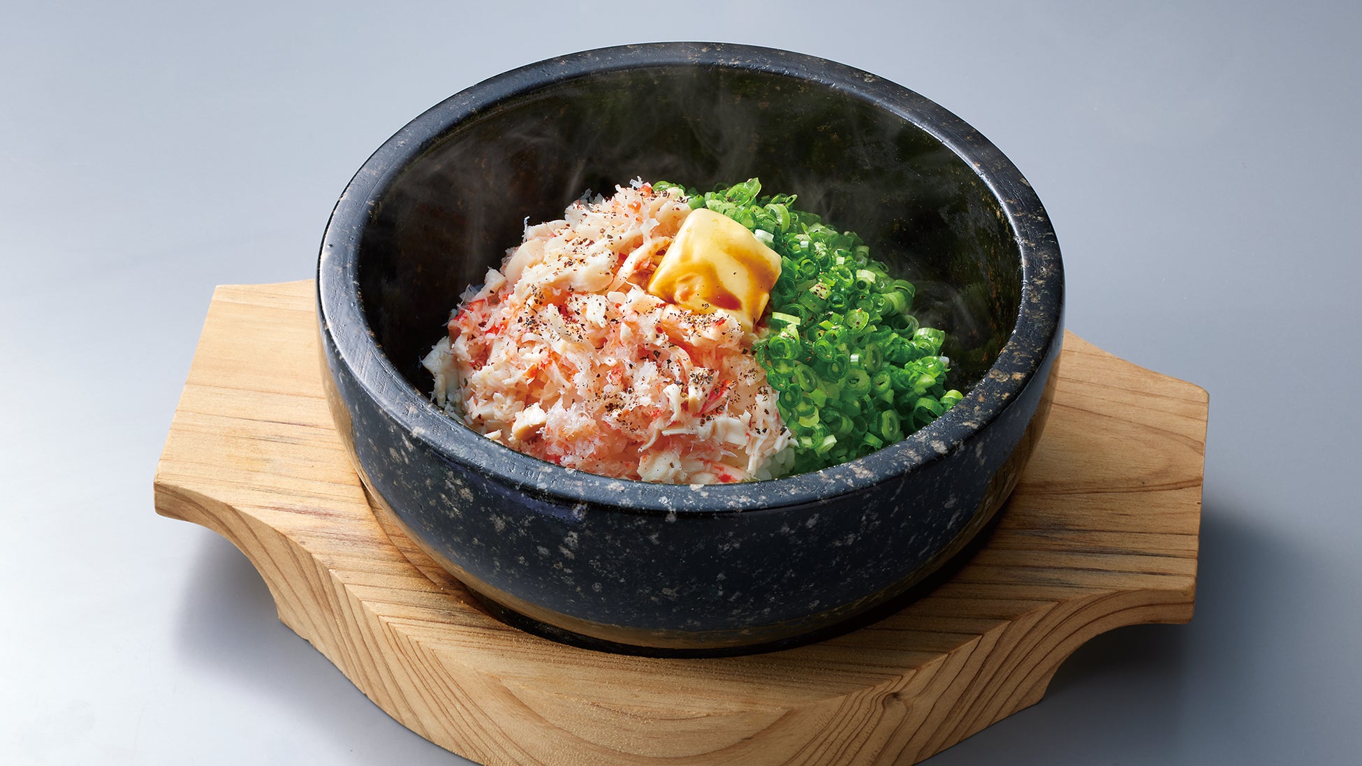 たっぷりと紅ずわいを乗せた贅沢ごはんを、熱々の石鍋でご提供します。バター醤油の香りが堪りません。