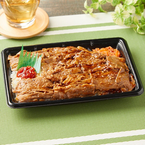 【内容】吉祥寺で人気の赤身肉焼肉専門店『肉山』監修の牛カルビ重です。炙り焼にした牛カルビ肉に、3種類の醤油、コチュジャンと甜面醤、特製辛味噌、リンゴ果汁などを使用した特製のタレをトッピングしました。別添で、『肉山』でも提供されている調味料「ヤンニョンジャン」を参考にした特製辛味噌を添えています。