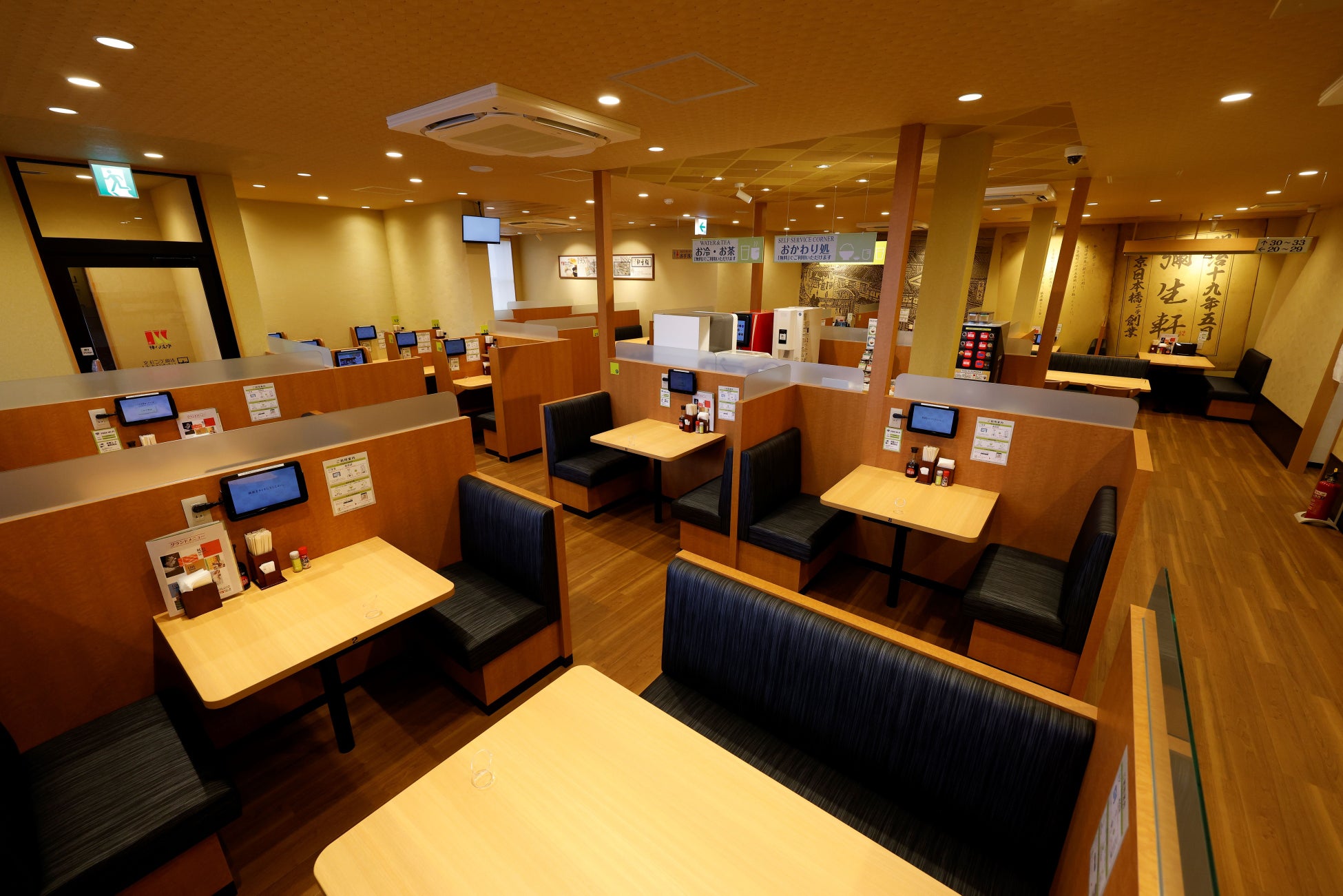 当店舗は2023年12月に公開しました新ロゴ・シンボルマークなど新しいブランドイメージを表現した店舗となっております。新ロゴ看板、モダンな“和”をイメージさせる暖簾(のれん)や「やよい軒」の名前のルーツでもある“彌生軒(やよい軒)”の歴史的資料をモチーフとした壁紙など、新ブランドステートメントを表現する“上質な”イメージでデザインされた店舗です。また、新しい取り組みとして、ゆっくりとメニューを選んでいただけるようテーブルに設置したタブレット端末からのオーダーや店舗限定デザートメニューの導入、さらにドリンクバーを設置することでくつろぎの時間を過ごしていただけるようにしました。 もちろん、“ごはん”や“だし”、“漬け物”のおかわり自由が楽しめる『おかわり処』もございます。