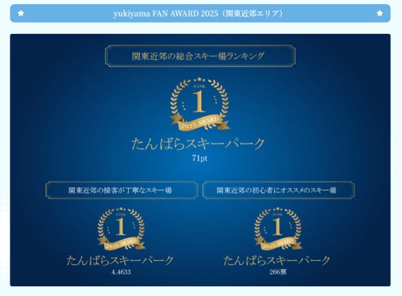 たんばらスキーパークは国内最大級のスキー場・積雪情報サイト「SURF&SNOW」のユーザーが選ぶスキー場ランキング2024-25の2部門にて関東エリアNo.1に選ばれました。さらに、GPSを使用し滑走記録を取ることができるアプリ「yukiyama」のアプリユーザーが選ぶ、「yukiyama FAN AWARD2025関東近郊エリア」にて総合1位を獲得しました。
