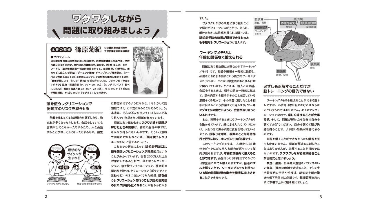 脳の中で記憶や情報を一時的に保持し、必要な時に引き出す能力のことをワーキングメモリと呼んでいます。この機能は18歳から25歳をピークにだんだんと衰えていきますが、脳活パズルに取り組むことで年齢に関係なく鍛えることができると言われています。問題が解けたときには快感が得られる脳トレは、認知症予防の効果が期待できるもっとも手軽なレクリエーションともいわれています。