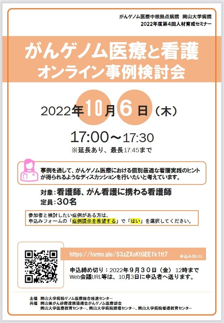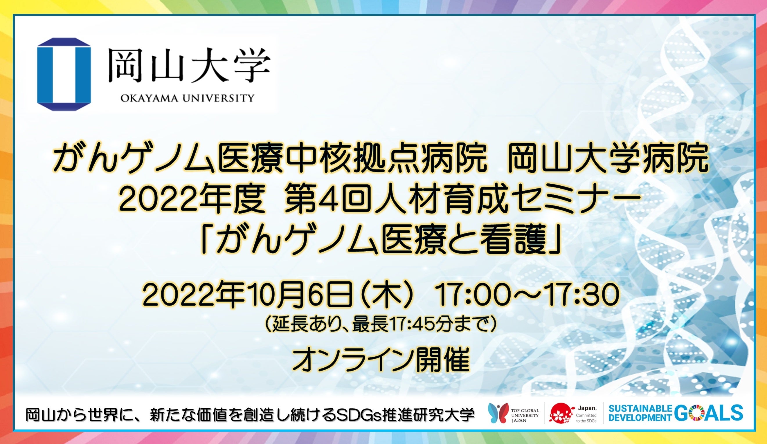 【岡山大学】がんゲノム医療中核拠点病院 岡山大学病院 2022年度第4回人材育成セミナー「がんゲノム医療と看護 オンライン事例検討会」〔10/6,木〕