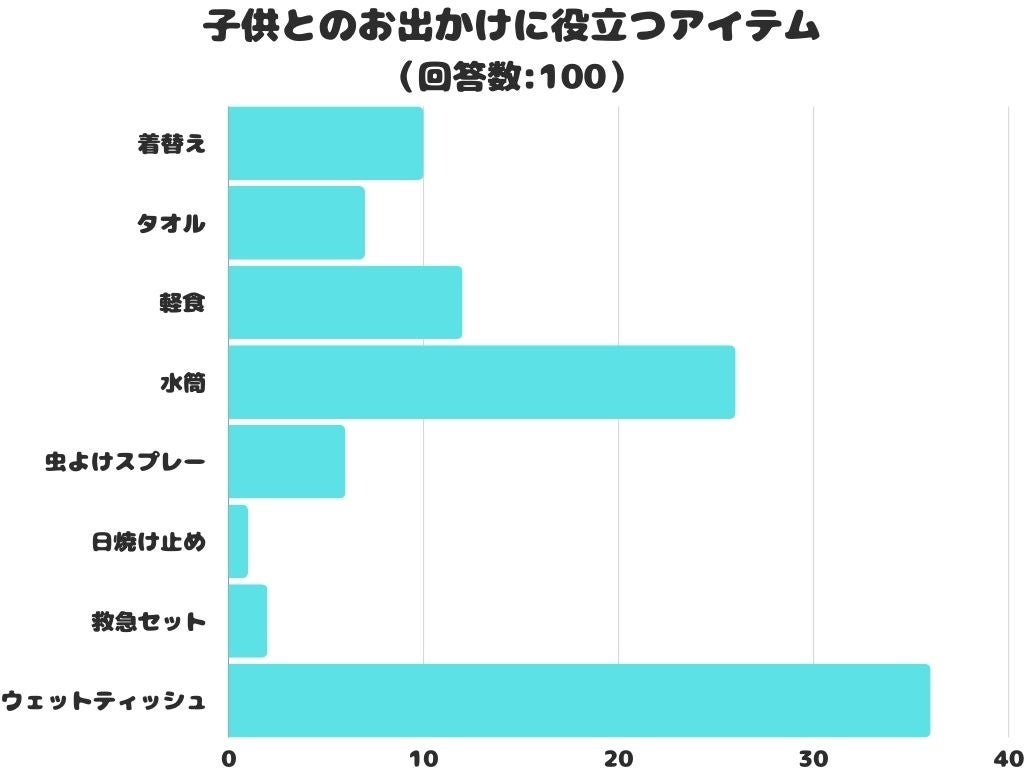 子供とのお出かけに役立つアイテムをアンケートにて調査したところ、1位は「ウェットティッシュ」でした。