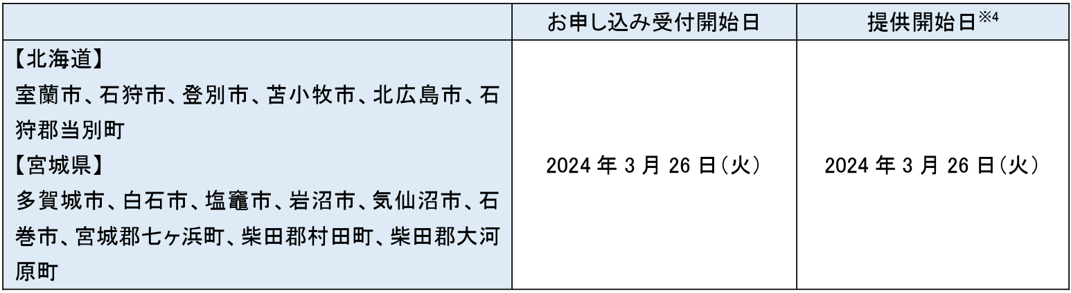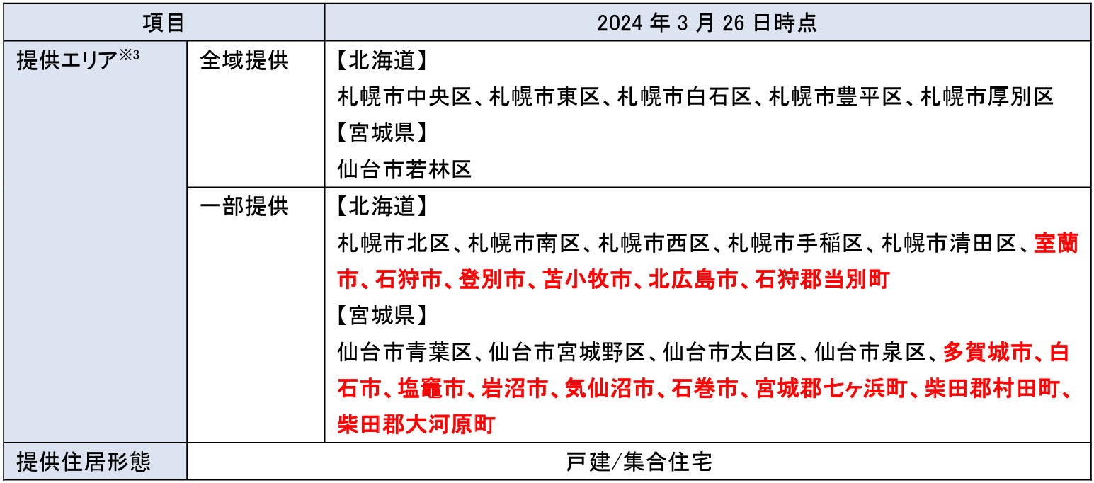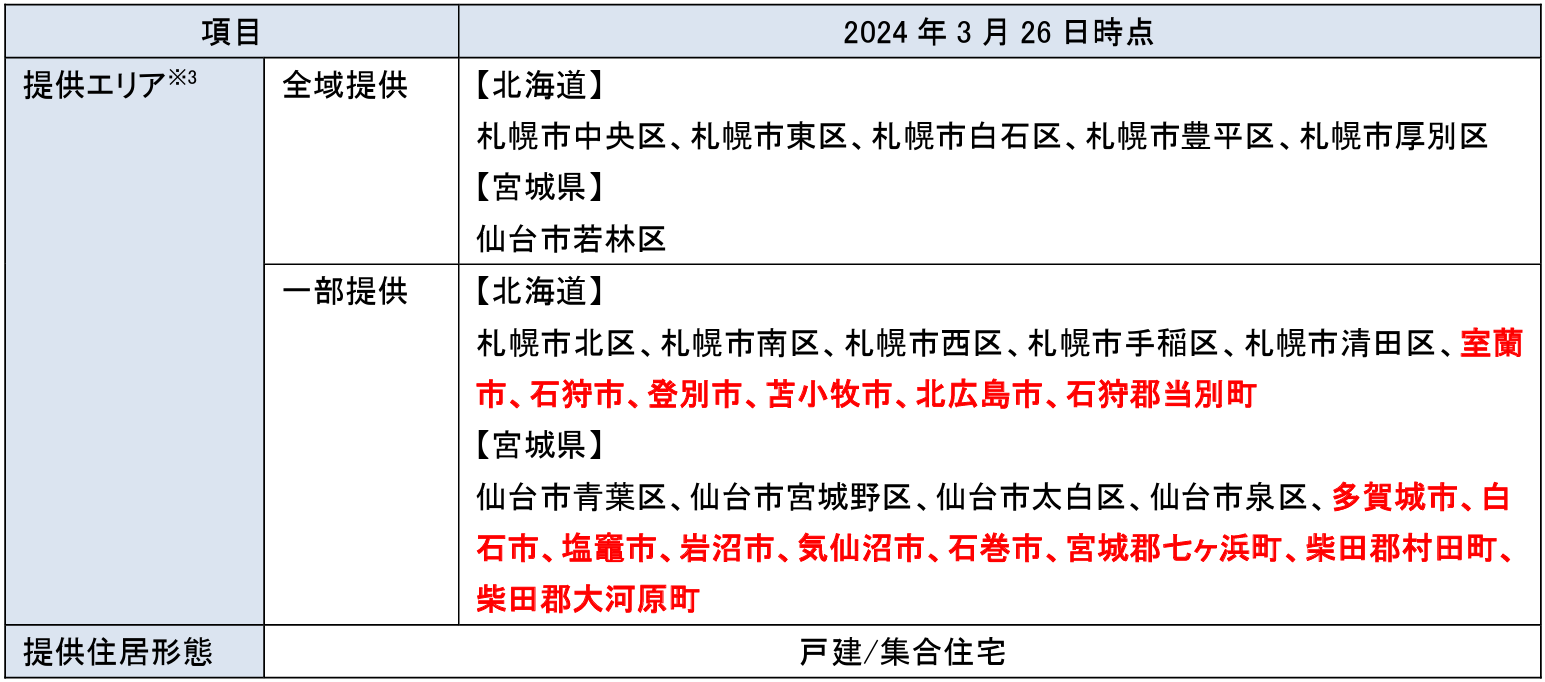 ※3.太字が3月26日に新たに提供開始となるエリアなります。北海道、宮城県においての追加拡大は順次実施予定です。詳細確定次第、別途お知らせさせていただきます。上記提供エリア内であっても、お客さまの建物設備等の状況により、サービスご利用をお持ちいただく場合や、サービスをご利用できない場合があります。