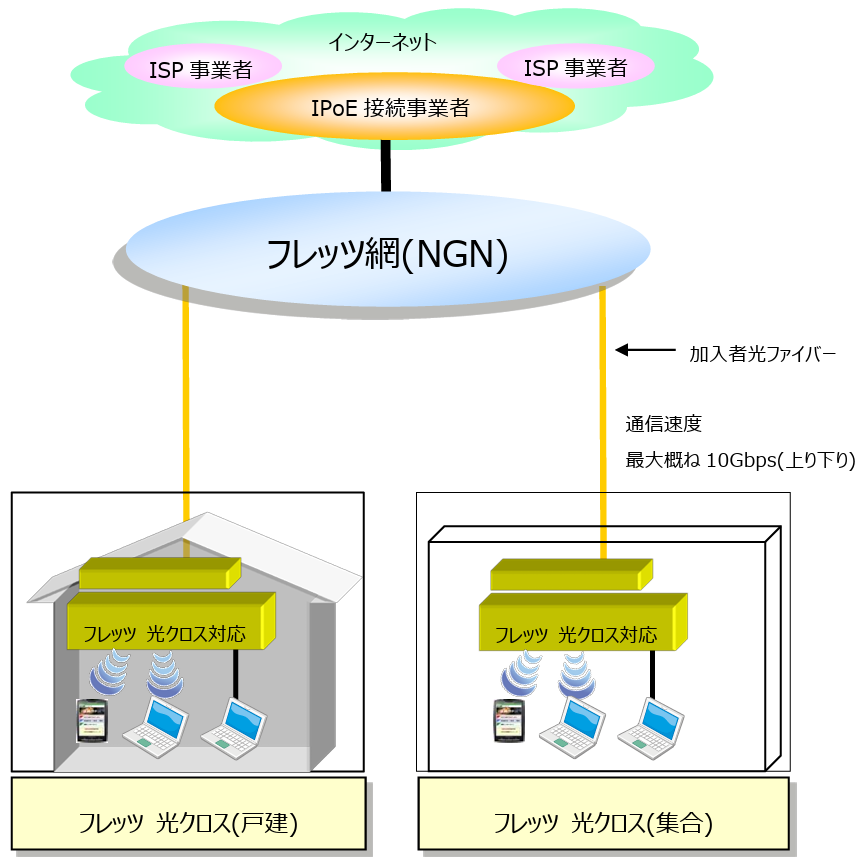 フレッツ 光クロス(以下、本サービス)は、加入者光ファイバーを複数のお客さまで共用し、お客さまが契約するインターネットサービスプロバイダーさま等へ上り/下り最大概ね10Gbps※1の通信速度で接続するベストエフォートサービスです。
