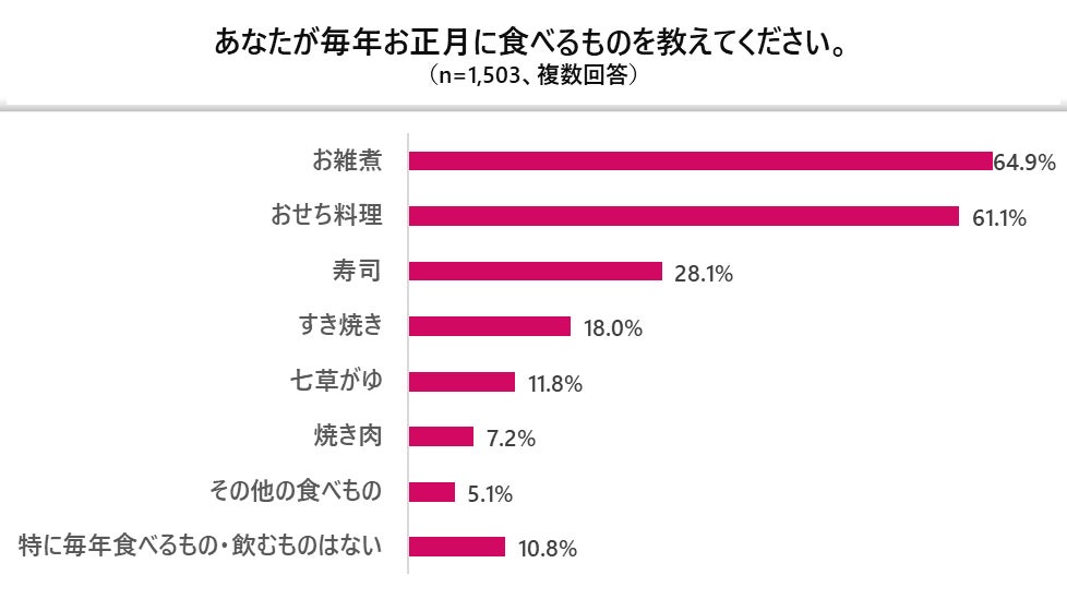 まず、毎年お正月に食べるものが何であるのかを複数選択で聞いたところ、最も多かった回答は「お雑煮」で64.9%、続いて「おせち料理」が61.1%、「寿司」が28.1%、「すき焼き」が18.0%、「七草がゆ」が11.8%となりました。「お雑煮」が「おせち料理」と僅差で1位になりましたが、どちらも6割の人が毎年お正月に食べていることが分かりました。