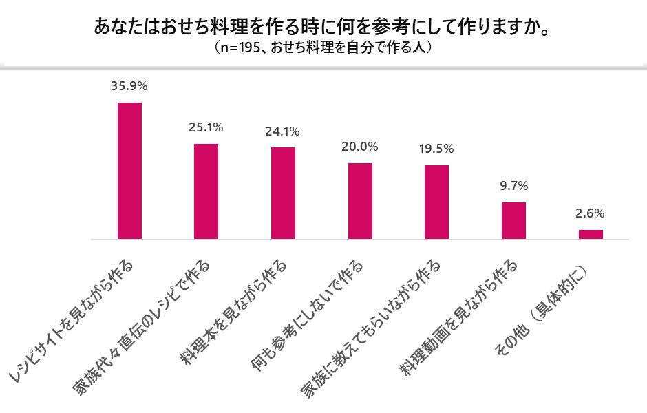 またおせち料理を作る人に何を参考にして作るかを複数選択で聞いたところ、1位は「レシピサイトを見ながら作る」で35.9%、2位は「家族代々直伝のレシピで作る」で25.1%、3位は「料理本を見ながら作る」で24.1%、4位は「何も参考にしないで作る」で20.0%、5位は「家族に教えてもらいながら作る」で19.5%となりました。伝統的な日本のお正月のお料理ということもあり、家族から教わったり家族と作っていたりする人が多いことが分かりました。
