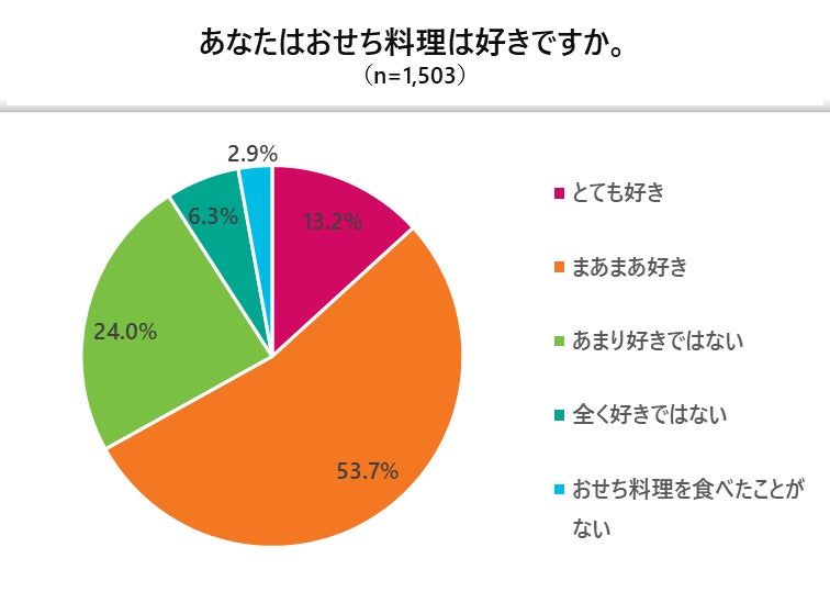 6割が食べているおせち料理ですが、おせち料理が好きかどうかを聞いたところ、「とても好き」と回答をした人が13.2%、「まあまあ好き」と回答した人が53.7%となり、日本のお正月の伝統的なお料理であるおせち料理を6割の人が好んでいることが分かりました。一方おせち料理が「あまり好きではない」は24.0%、「全く好きではない」が6.3%、また「おせち料理を食べたことがない」と回答をした人は2.9%となりました。