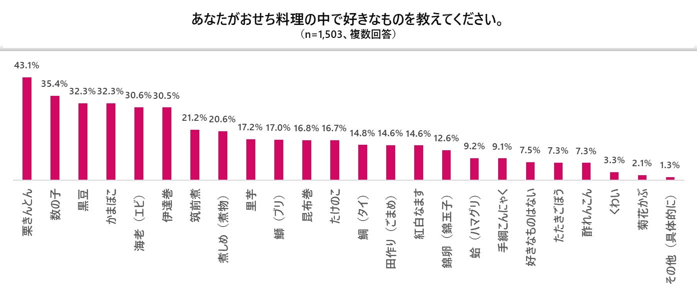 - 好きなおせち料理トップ5 1位「栗きんとん」 2位「数の子」 3位「黒豆」「かまぼこ」 5位「海老」