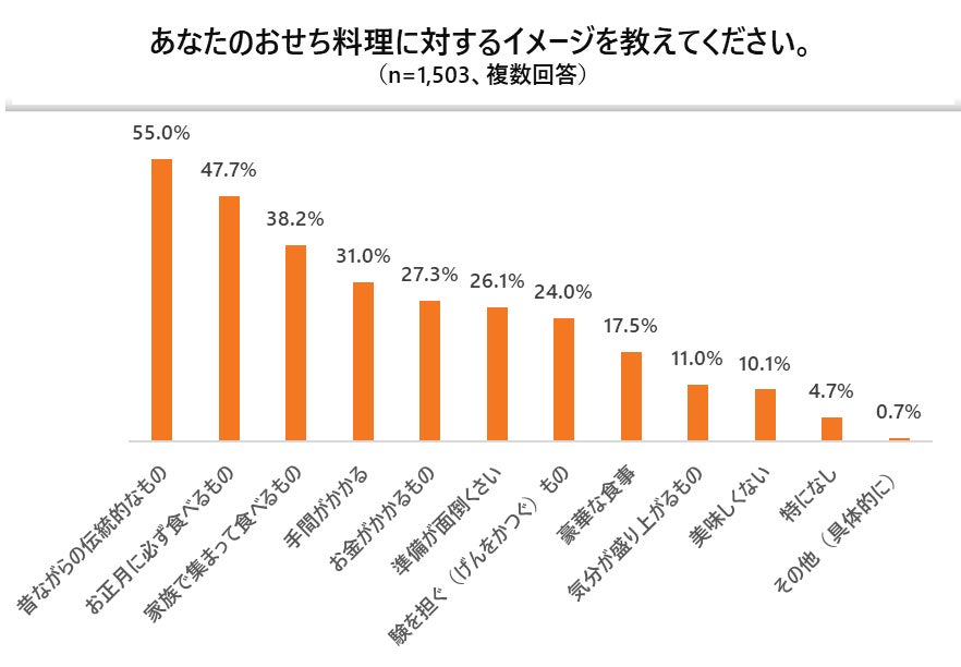 ●おせち料理のイメージは?1位「昔ながらの伝統的なもの」 2位「お正月に必ず食べるもの」 3位「家族で集まって食べるもの」